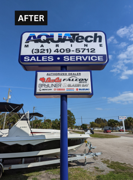 Through the assistance of the City’s Commercial Property Enhancement Program (CPEP) grant funding, Aqua Tech Marine, located at 2723 Palm Bay Road NE, was able to replace its outdated pole sign with a double-sided, internally-illuminated freestanding pole sign. The business received $5,000 in CPEP grant funding towards their total project investment of $14,149.92.