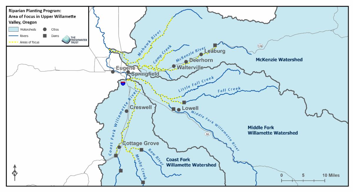 The MWMC is working with The Freshwater Trust and local watershed councils to improve the health of our rivers and streams. Our non-profit partners are looking to plant and maintain an attractive, resilient mix of native trees and shrubs in a buffer along the water’s edge at sites along the banks of the McKenzie, Mohawk, Middle Fork Willamette, Coast Fork Willamette and Row Rivers. They’d love to talk with you if you have a suitable site available.