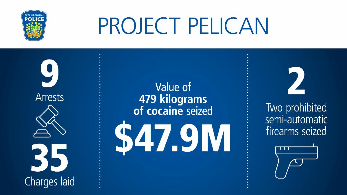 Peel Regional Police, working with national and international partners, have dismantled a transnational organized criminal network trafficking illicit drugs into the Greater Toronto Area (GTA). The investigation, Project Pelican, marks the largest drug seizure in the service’s history – with nearly $50 million worth of cocaine seized.