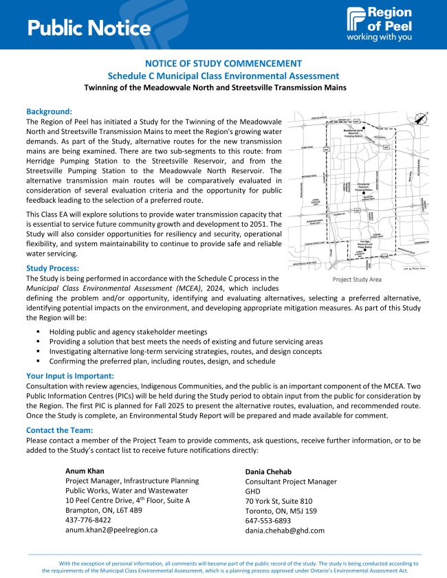 The Region of Peel has initiated a Study for the Twinning of the Meadowvale North and Streetsville Transmission Mains to meet the Region's growing water demands. As part of the Study, alternative routes for the new transmission mains are being examined. There are two sub-segments to this route: from Herridge Pumping Station to the Streetsville Reservoir, and from the Streetsville Pumping Station to the Meadowvale North Reservoir. The Study will explore solutions to provide water transmission capacity to service future community growth and development to 2051.