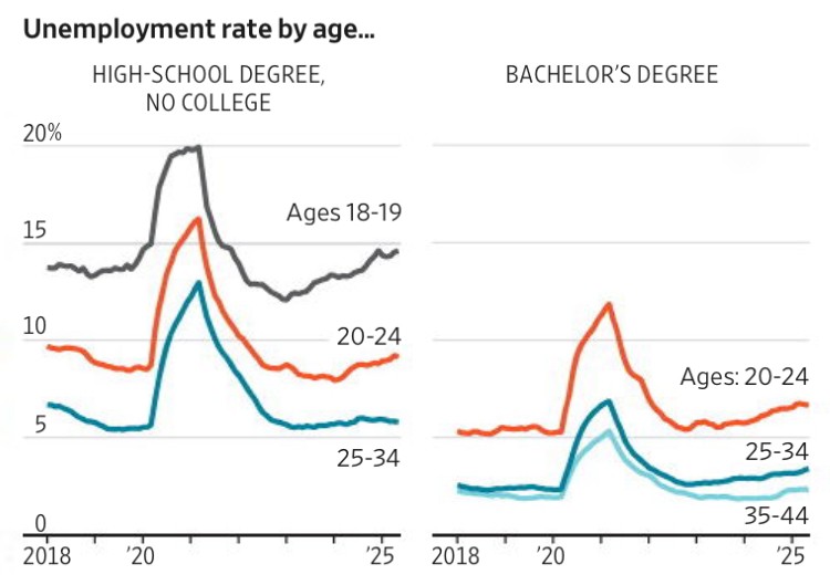 The annual unemployment rate for recent graduates in the United States was 6% for the 12 months ending in May 2024, compared to the rate increase to 6.6% in May 2025. The graph displays the data for both high-school and college graduates based on age.