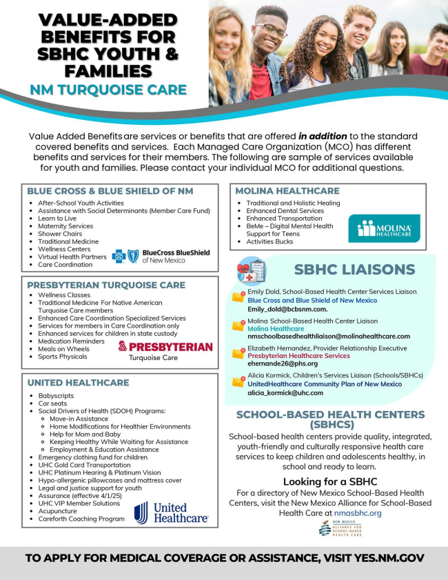 | | Value Added Benefits are additional services or benefits that Managed Care Organization (MCO) offer for their members. It is important to communicate with your MCO for these services. The flyer has a list of some of these benefits for SBHC Youth and their families. | | |