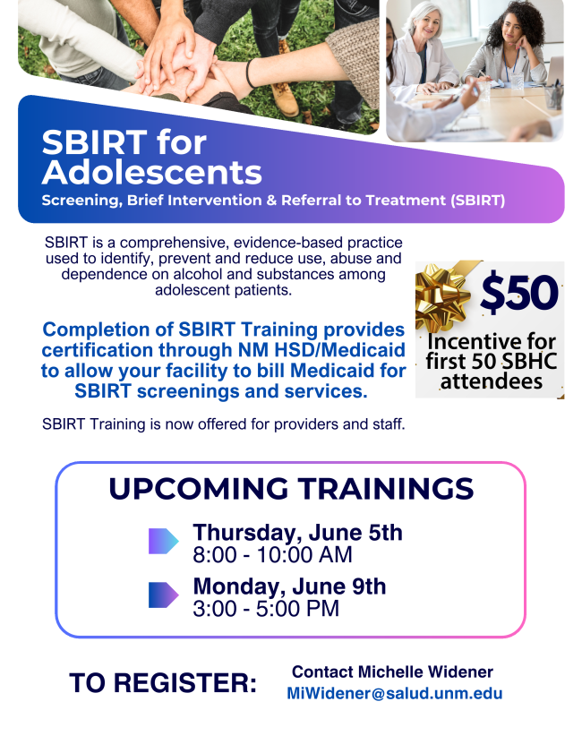 For more information or to schedule a training, please contact NM-ABC program manager Amy Glass at aeglass@salud.unm.edu
