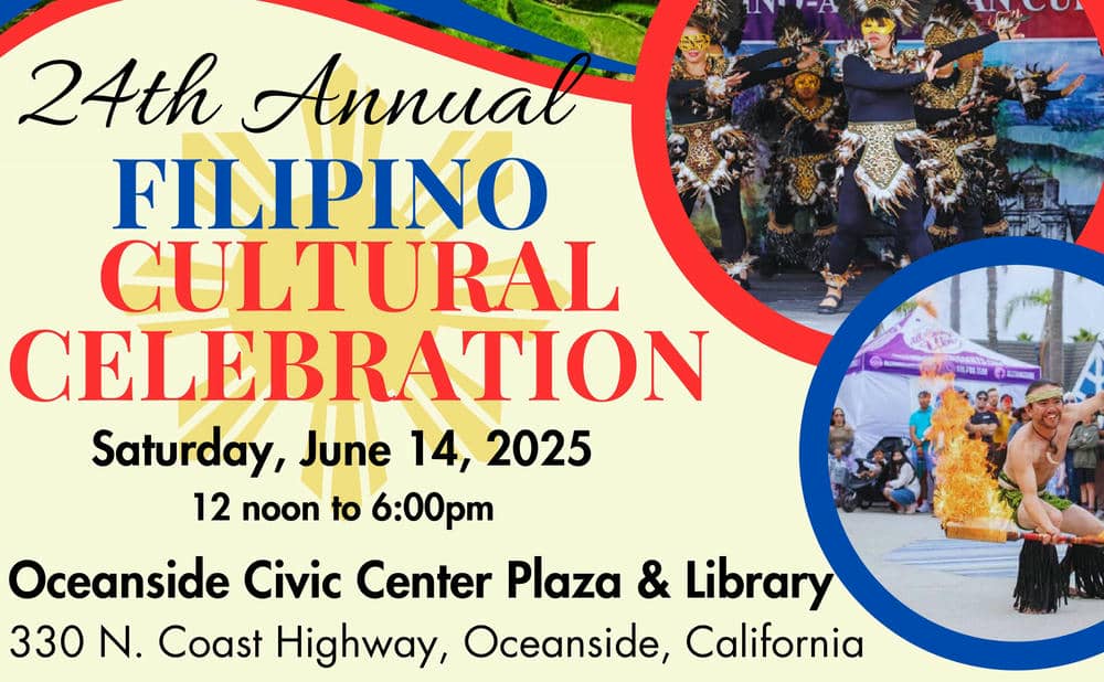 Mark your calendars for a celebration of Filipino heritage at the 24th Annual Filipino Cultural Celebration! This free event will take place on Saturday, June 14, 2025, from 12:00 p.m. to 6:00 p.m. at the Oceanside Civic Center. Bring your family for a day filled with entertainment, children’s crafts, a variety of vendor products and services, opportunity drawings, and more! Experience the vibrant traditions, delicious cuisine, and rich history of the Filipino community in a festive and family-friendly atmosphere! For more information, click here to visit the event website!