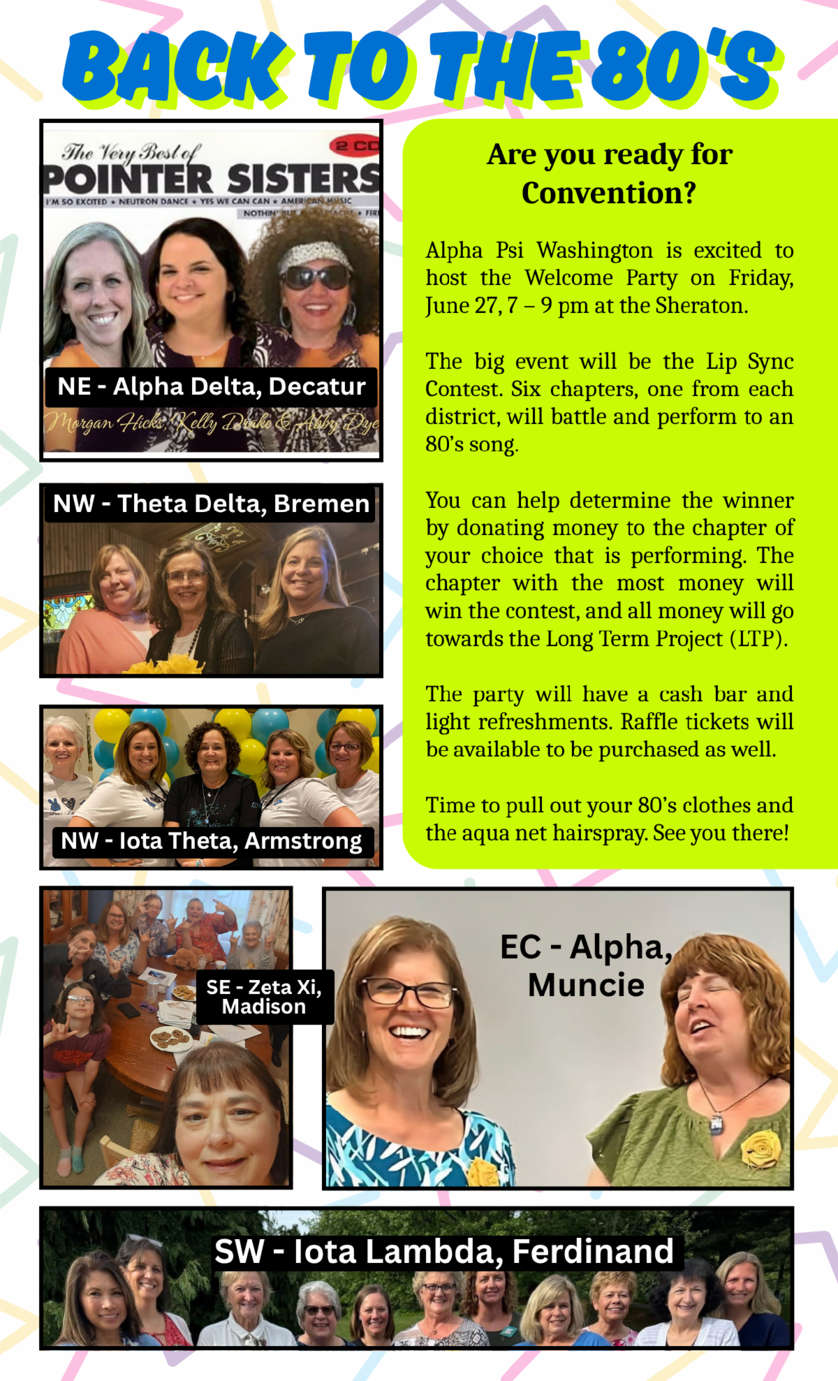 Upsilon has been especially focused on keeping convention costs as low as possible. We have received donations from local businesses, organizations, and individuals to help cover some of the costs, but we couldn't do it without you and your willingness to attend. Thank you to our sisters who are participating in convention! Thank you for your commitment to making our event a success. We hope you find the workshops and networking opportunities useful. We hope you will participate in fellowship with your sisters and make new friends, and we appreciate your support.