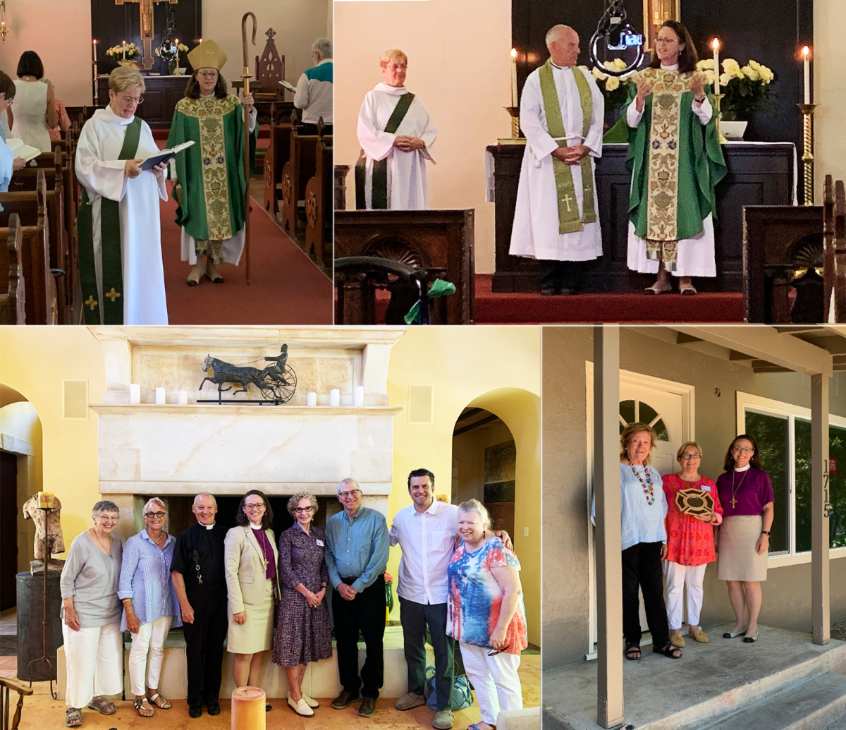 Top Left: Bishop Megan, accompanied by Deacon Marcia Hansen, process after services; Deacon Marcia and Bishop Megan with Priest in Charge the Rev. Mac McIlmoyl; Bottom Left: Bishop Megan with the Mission Committee of St. Luke's; Bottom Right: Senior Warden Carolyn Czapleski and Junior Warden Connie Rios Schellenger show Bishop Megan the recently renovated vicarage.