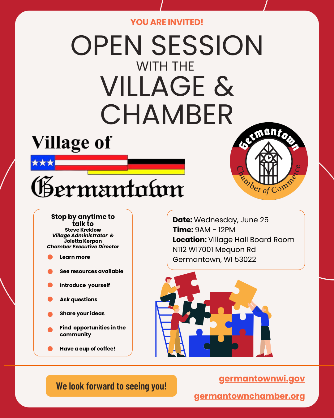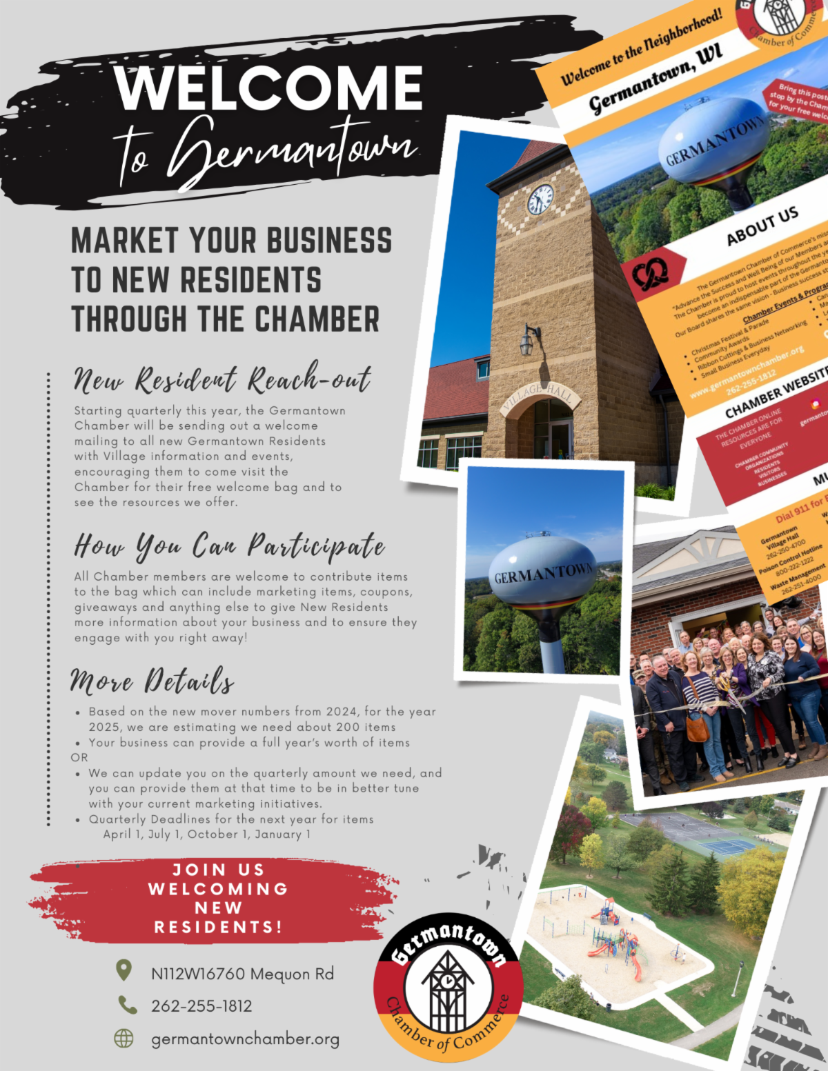 Starting quarterly this year, the Germantown Chamber will be sending out a welcome mailing to all new Germantown Residents with Village information and events, encouraging them to come visit the Chamber for their free welcome bag and to see the resources we offer.
