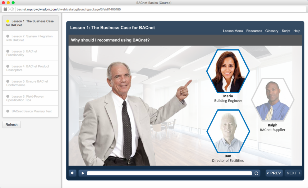 includes six lessons and covers system integration, network types, avaiable functions, and how to ensure products are conformant to the BACnet specification.