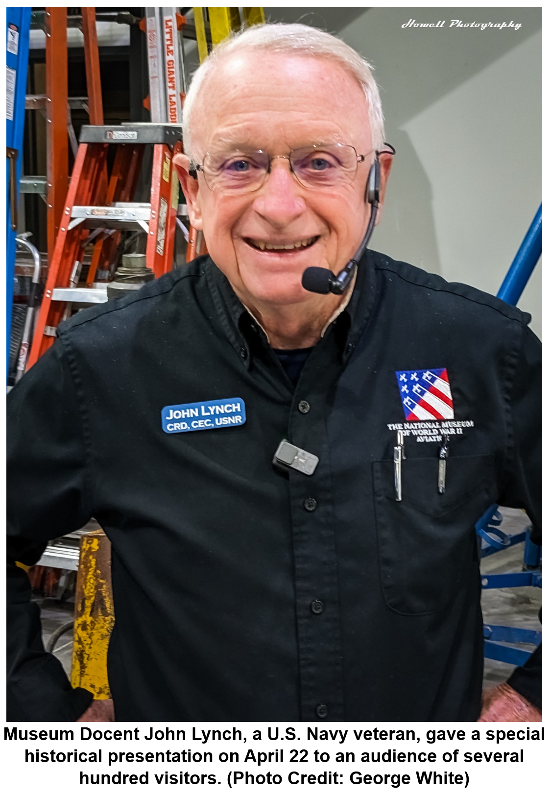 But, Docent John Lynch, a U.S. Navy veteran, said to an audience of several hundred during an April 22 special historical presentation at the Museum, it was the battle that affected everything else because the Allies HAD to win. If German submarines had been able to choke off the shipborne supply of petroleum, munitions, and food from the U.S. and Canada to Britain and the Soviet Union, the 1944 Allied invasion of Normandy could not have taken place. Nor could many other war-winning Allied initiatives. In fact, Lynch noted, British Prime Minister Winston Churchill said the possibility of losing the Battle of the Atlantic was the only thing that really frightened him.