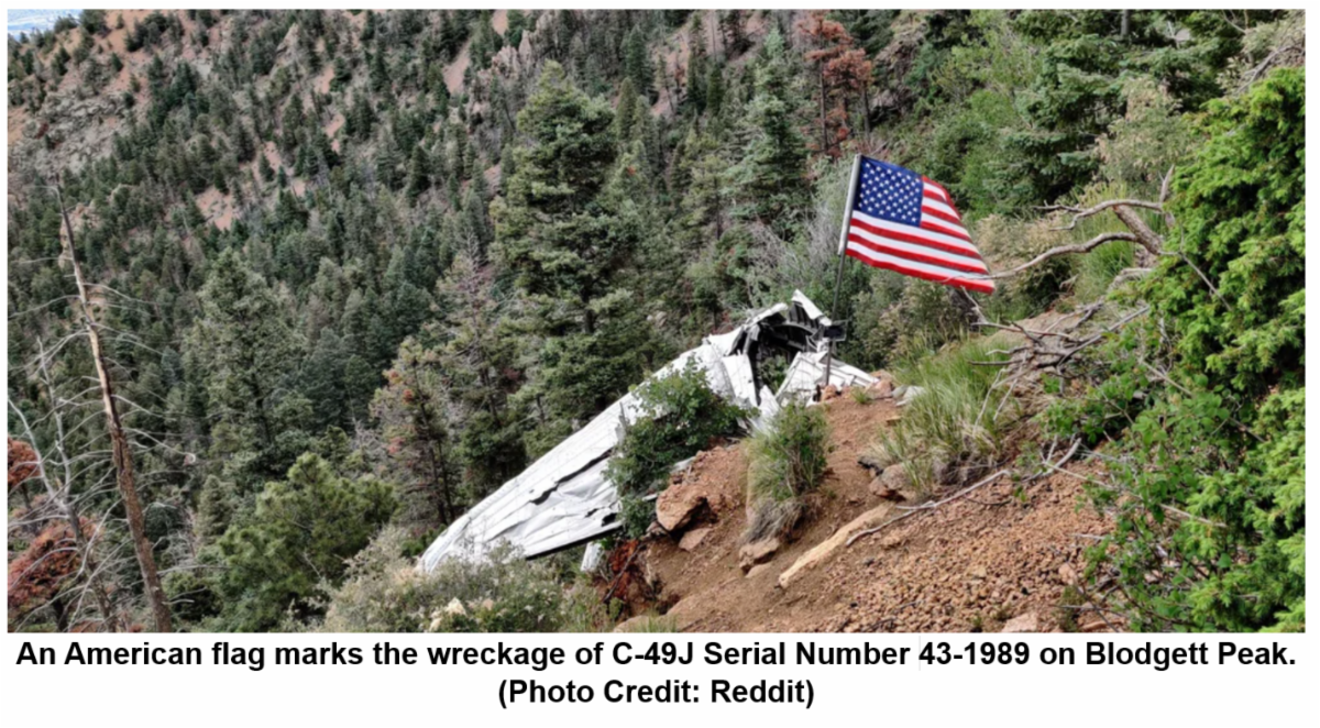 Many in Colorado Springs would be surprised to learn that a variant of the plane, a C-49J, crashed on nearby Blodgett Peak on February 23, 1943, killing the three men aboard. They were flying cargo from Pueblo to Denver in bad weather when they hit the 9,400-foot peak.
