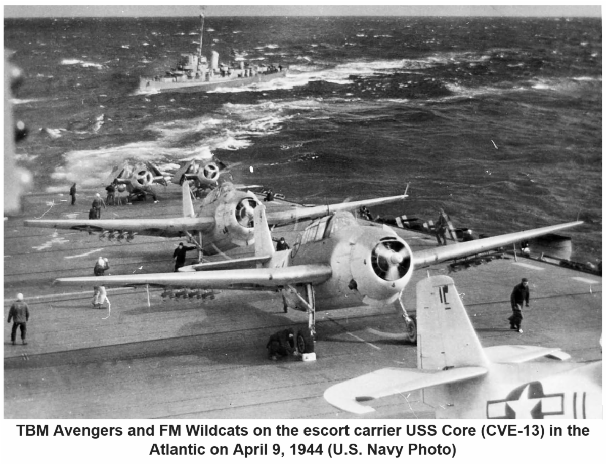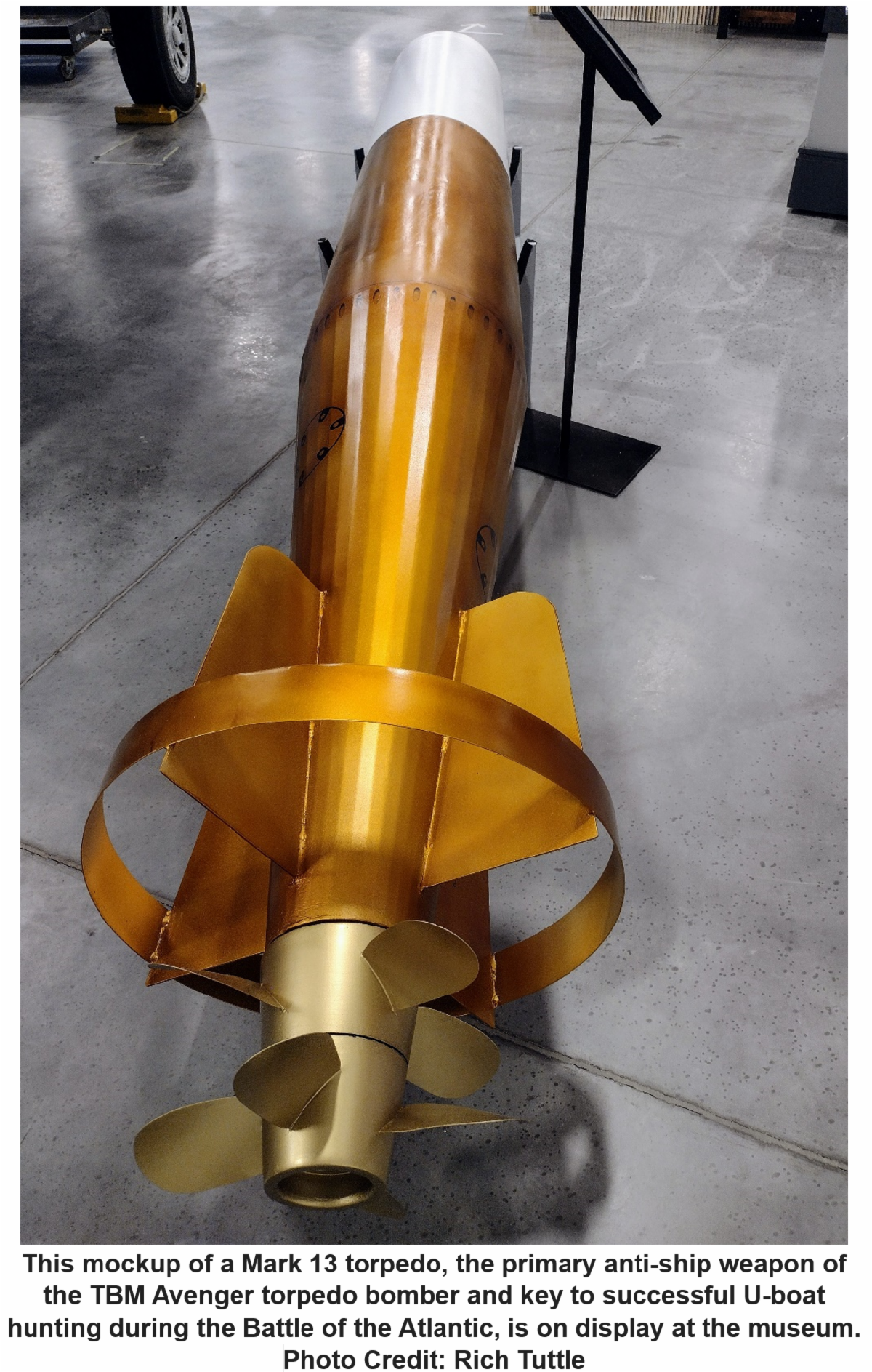The Avenger torpedo bomber -- the Museum has two TBM-3E examples -- was one of the types that flew from the escort carriers. The Avenger made a name for itself in the Pacific, but its ruggedness and adaptability helped make it a valuable contributor to the Atlantic U-Boat fight. It could carry a variety of weapons such as rockets, depth charges, sonobuoys and acoustic homing torpedoes, in addition to the big Mark 13 torpedo and the bombs used in the Pacific.