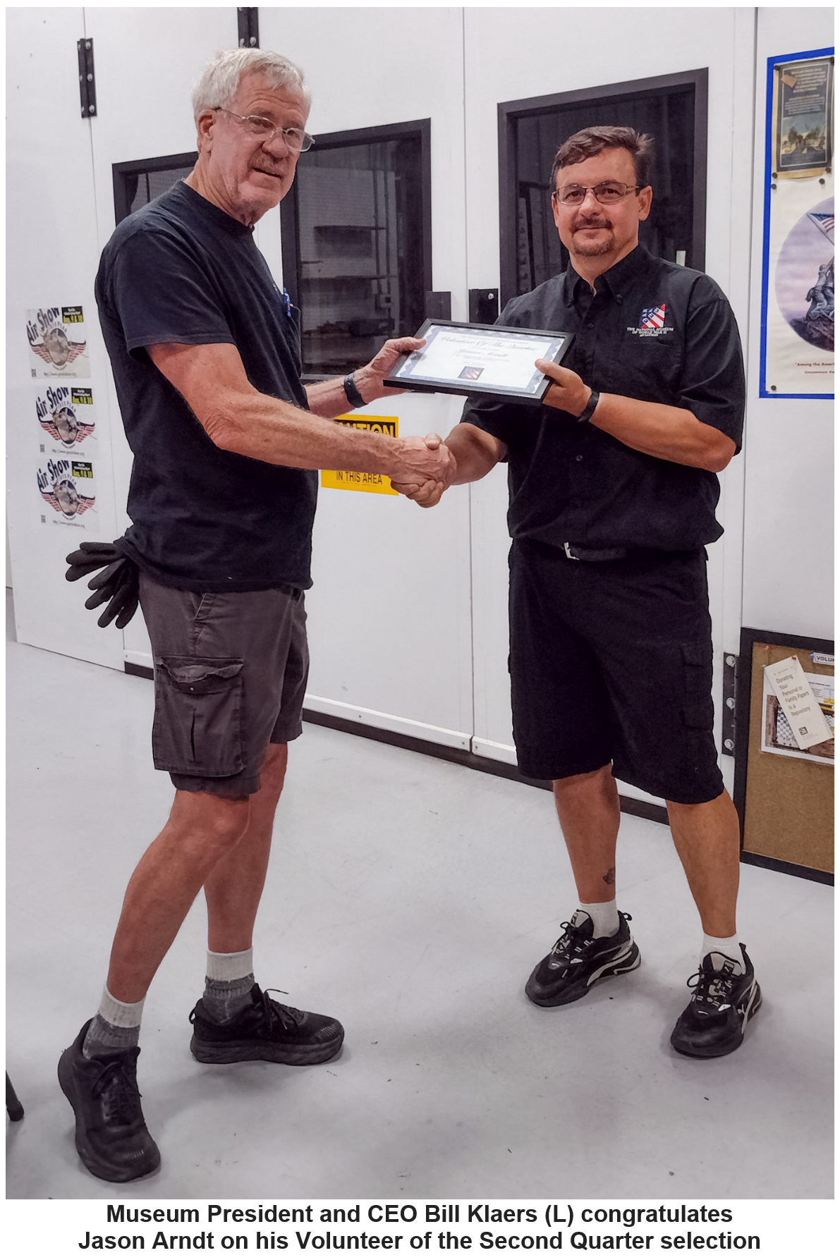 Jason Arndt was named the Museum's Volunteer of the Second Quarter in a brief ceremony and light lunch in Hangar 1A. "This has been a long time coming," said Bill Klaers, president and CEO.