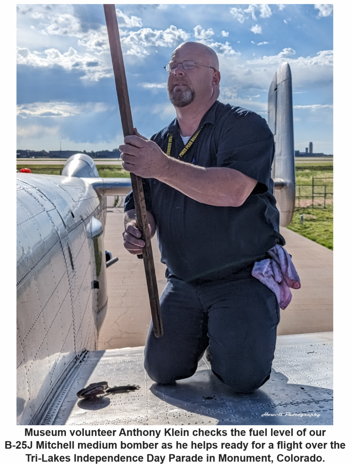 Klaers said Jason "has done everything," including wiring of facilities, helping to maintain aircraft and buildings, and being crew chief on flights of our B-25J Mitchell medium bomber. Jason has also volunteered to run the aircraft ramp at past Pikes Peak Regional Air Shows at the Colorado Springs Airport. Klaers announced that Jason will run the ramp at the next air show, in August 2024.