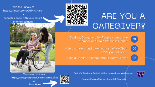 Are you or someone you know a caregiver for a patient seen at the UW Memory Brain and Wellness Clinic (MBWC)? A graduate student at the University of Washington is conducting research to better understand the Patient Portal needs of caregivers. Caregivers are invited to participate in a short survey, even if they do not currently use UW Medicine’s MyChart Patient Portal.