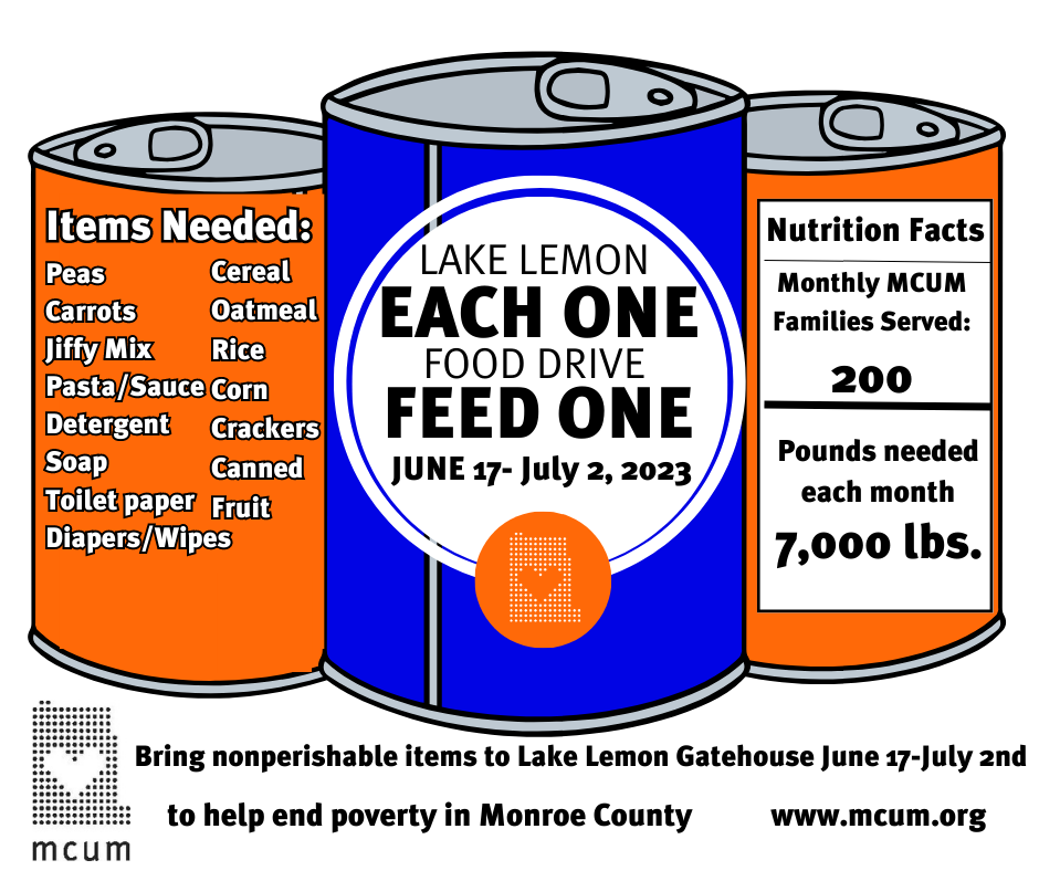 Hunger relief is the first step towards self-sufficiency. Help break the cycle of poverty by donating nonperishable food, cleaning, &/or hygiene items during Monroe County United Ministries largest annual food drive Each One Feed One June 17 - July 2nd.