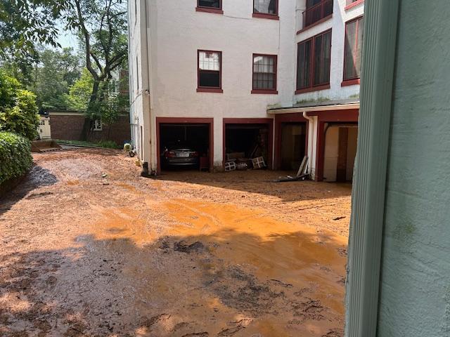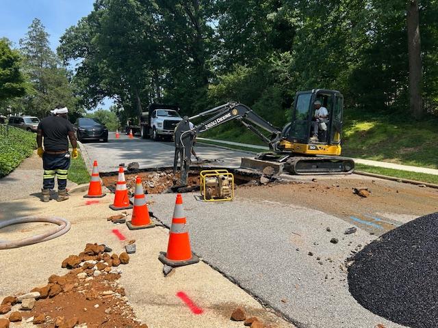 June 12, 2025: Tuscany Road and the Ridgemede Alley with water flowing down to the Gardens of Guilford. This break is a few yards from the previous break a year ago. DPW responded quickly to shut off the water, but water had already flooded the garages.