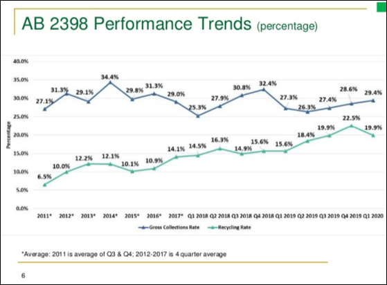 - The overall 2019 California recycling rate was 19.1%, up 25% versus 2018.