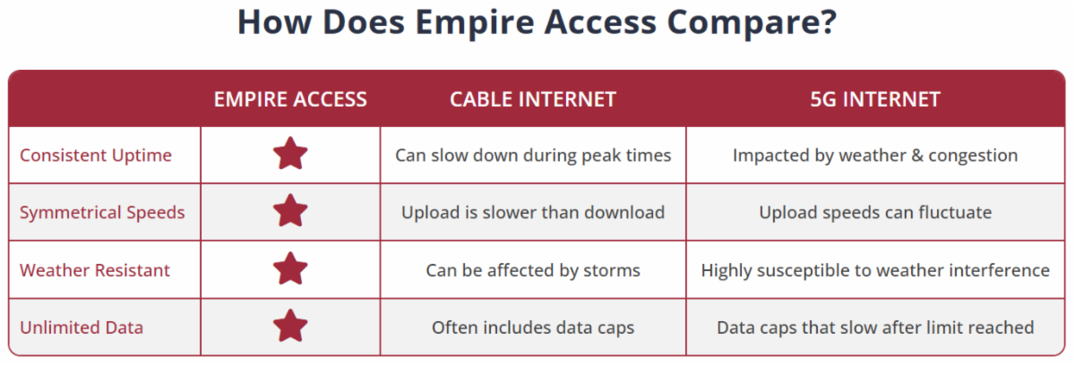 Our referral program lets you share the lightning-fast, super-reliable Empire Access experience with your neighbors, friends, and family. The best part? You’ll get rewarded for every new customer you bring our way! It’s a win-win: they get incredible internet, and you both get a free month of service.
