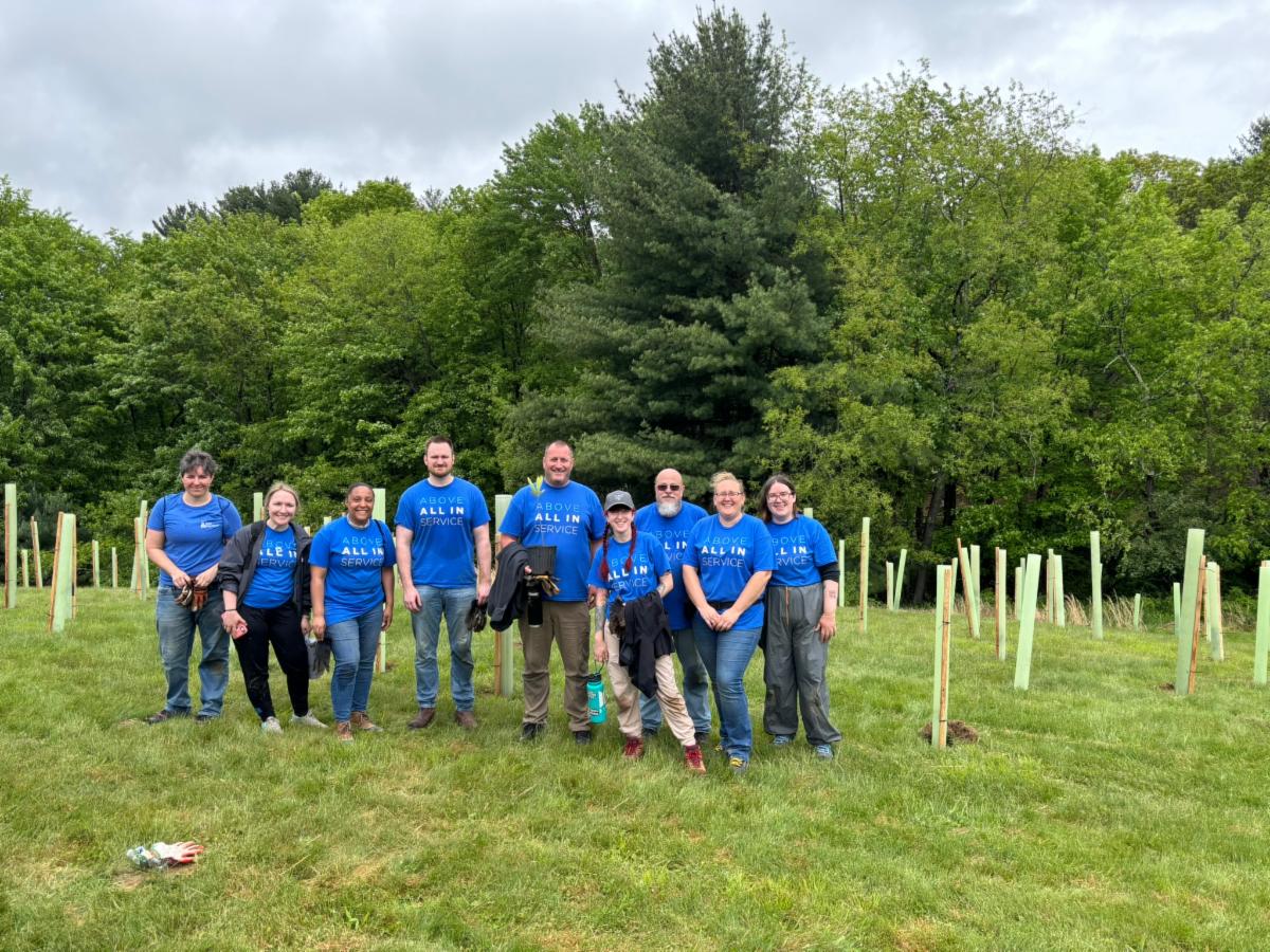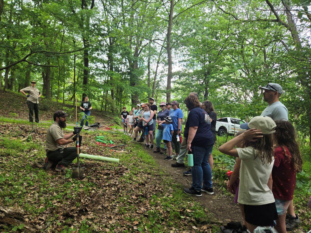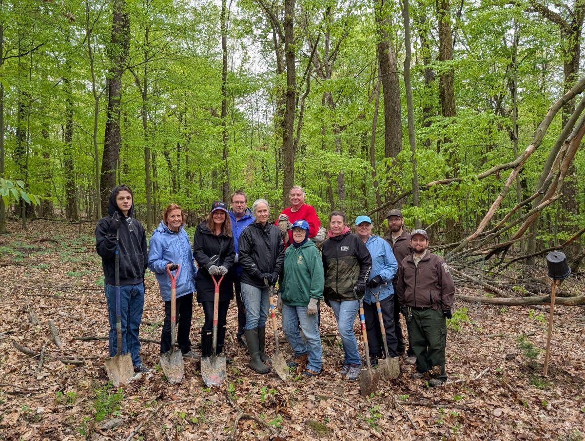 On May 6, we planted 50 trees in Hartwood Acres Park with the Daughters of the American Revolution, Kushkushkee Trail Chapter. The dedicated volunteers braved the threatening rain to help repair a canopy gap from the recent storms along the Red Trail near the Mansion overflow parking lot. We planted a beautiful mix of native species including striped maple, bottlebrush buckeye, Allegheny serviceberry, yellow birch, tulip poplar, umbrella magnolia, white pine and basswood. We extend a huge thank you to all the volunteers for their hard work and to the Allegheny County Park Rangers for leading the event! Thank you also to the Kushkushkee Trail Chapter and the Keystone Ten Million Trees for PA program, for donating the trees and the deer protection.