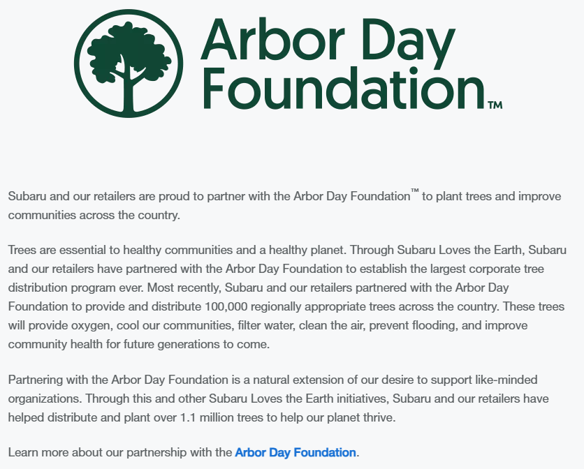 According to the Arbor Day Foundation web site, "The Arbor Day Foundation and Subaru have teamed up to establish the largest corporate community tree distribution program in the U.S." You can find more details here.