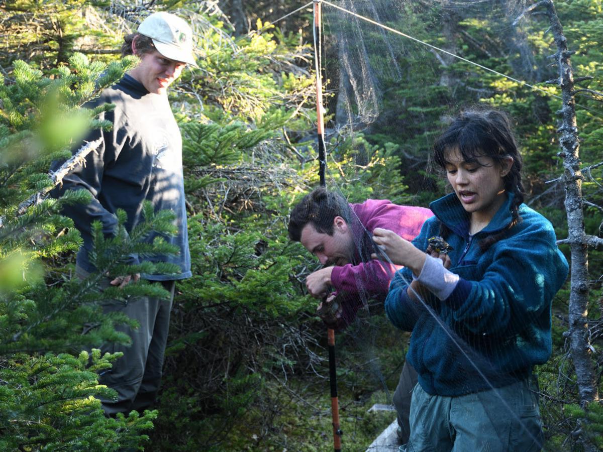 Kevin Tolan, Nathaniel Sharp, and Melory Brandao (L-R) check nets on Mt. Mansfield's Amherst Trail on June 1, 2023. © Michael Sargent