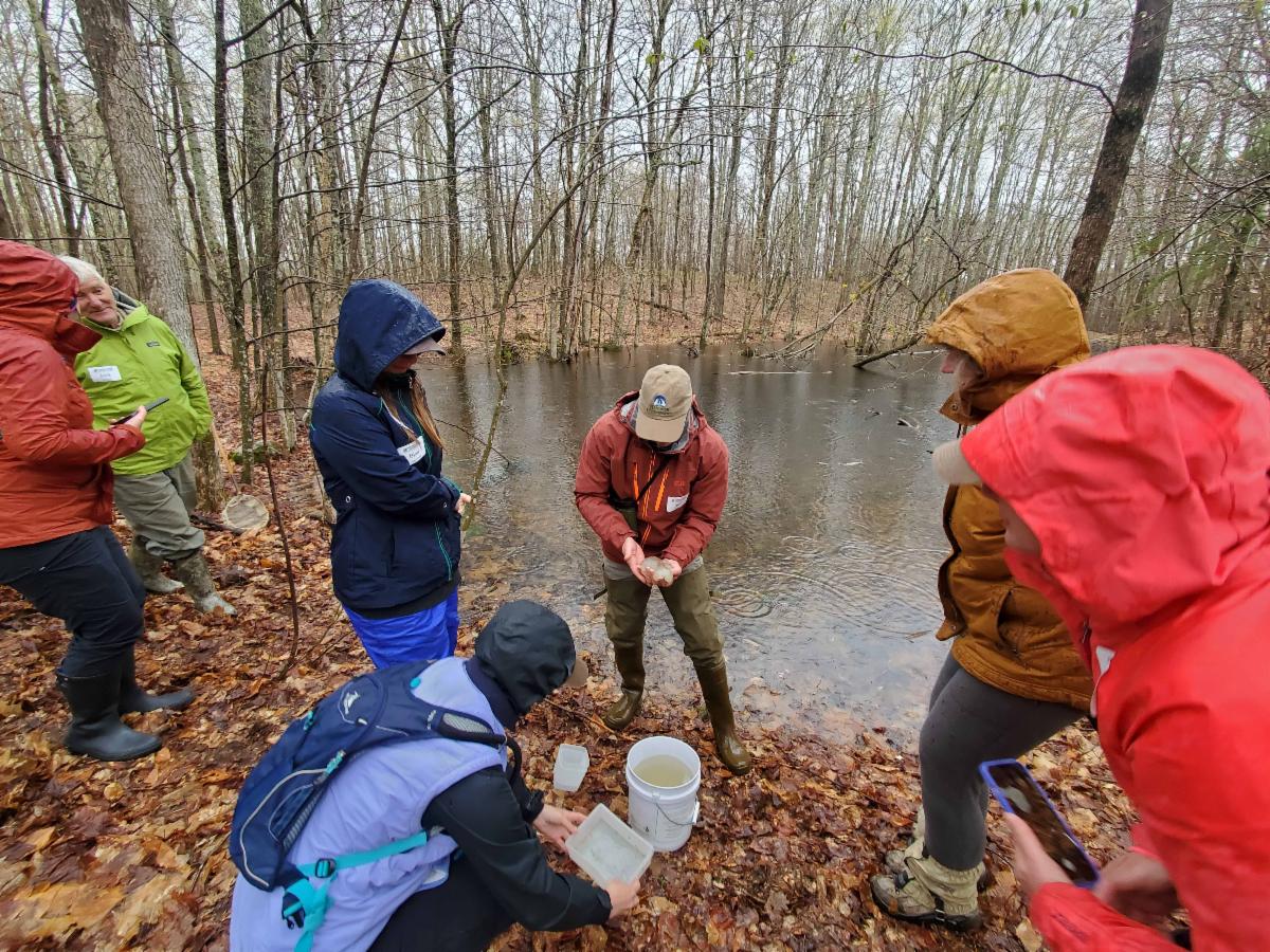 VCE biologist Steve Faccio shows a glob of salamander eggs to field trip participants. © Alyssa Fishman