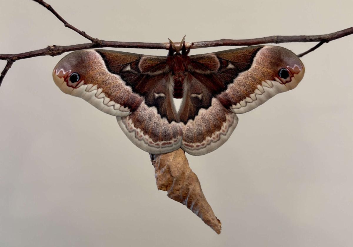 Promethea Silkmoth (Callosamia promethea) spreading its wings above its cocoon last June © Kent McFarland
