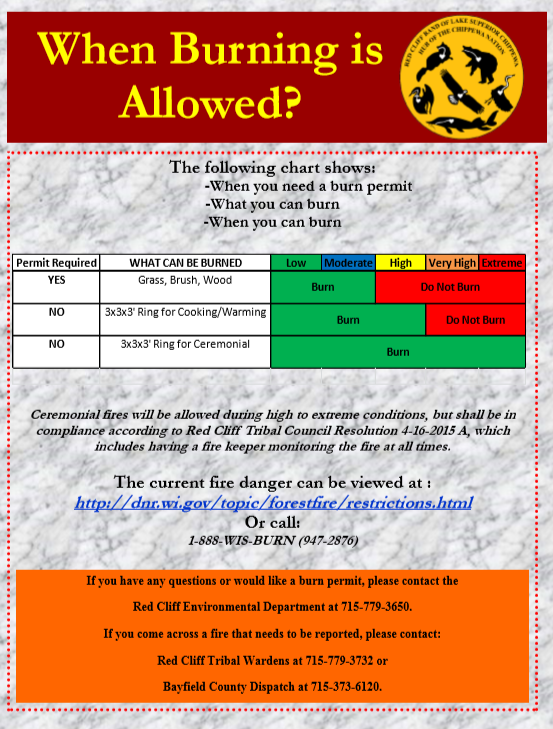 . Please terminate all burning activities under the Red Cliff Burn Permits issued by the Environmental Department until fire danger levels are “Low” or “Moderate” conditions. Per Tribal Resolution 4-16-2015A, burning grass, brush, wood in the 6x6x6 area are