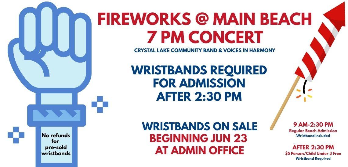 Avoid event day lines and pre-purchase your fireworks wristband Mon, Jun 23-Sat, Jul 5. This wristband is for fireworks admission to Crystal Lake Main Beach beginning at 2:30 pm on Jul 6