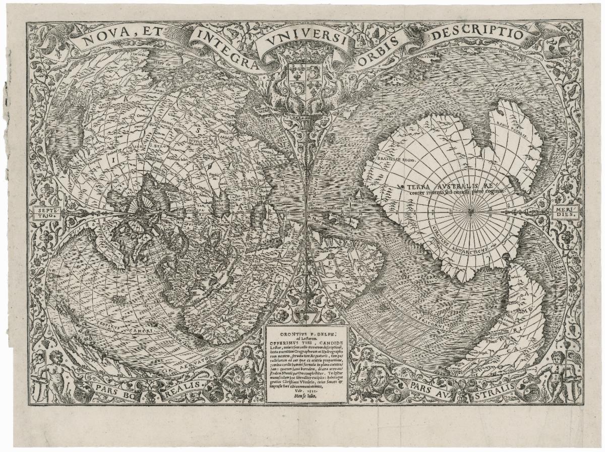 World. FINE, O. [Paris, 1531 [1532]] Nova, Et Integra Universi Orbis Descriptio . . . Orontius F. Delph . . . 1531 Mense Julio. 11 3/8 x 16 1/4 inches. Woodcut with a strong printing impression; overall near excellent. $49,500