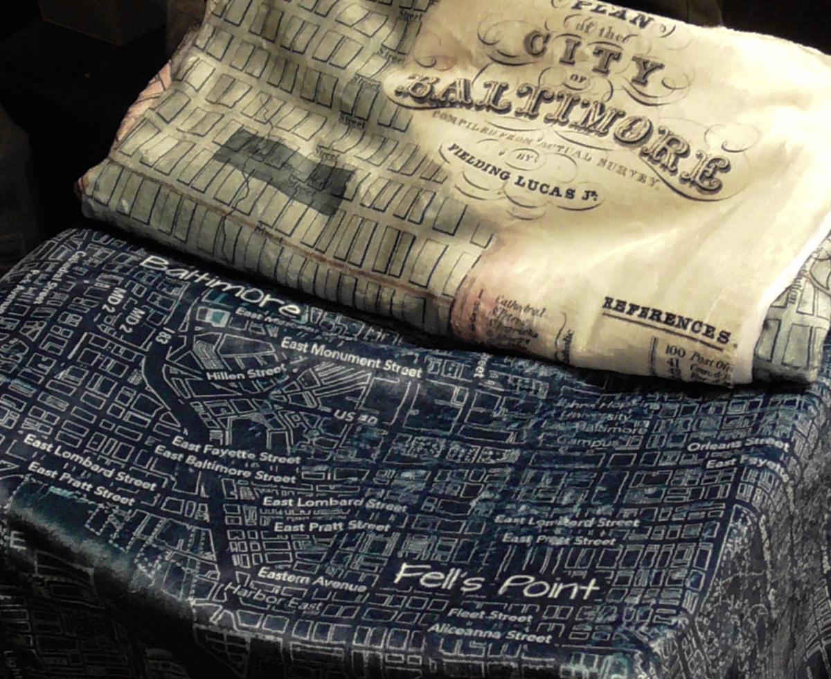 Baltimore map blankets. We have the vintage style, as well as a more modern blueprint version. Also, we have bath/beach towels and shower curtains (and the vintage map scarves should be here by the time you read this!)