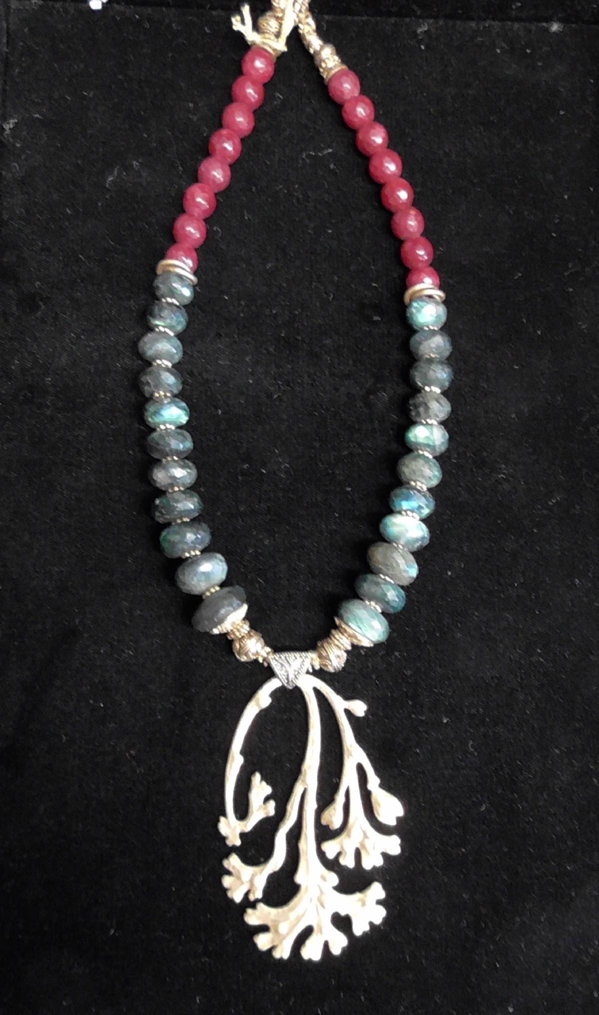 Labradorite, red jade, and 24K gold-plated bronze coral pendant