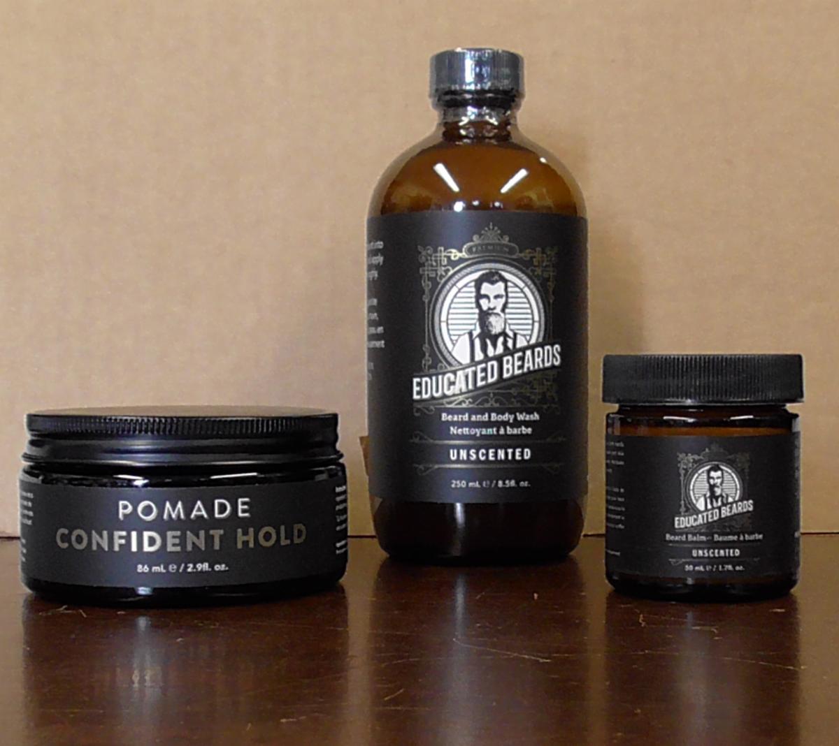 Men's body products. Beard and body wash, beard balm, and hair pomade. They're all unscented, so no challenges with picking the perfect scent.