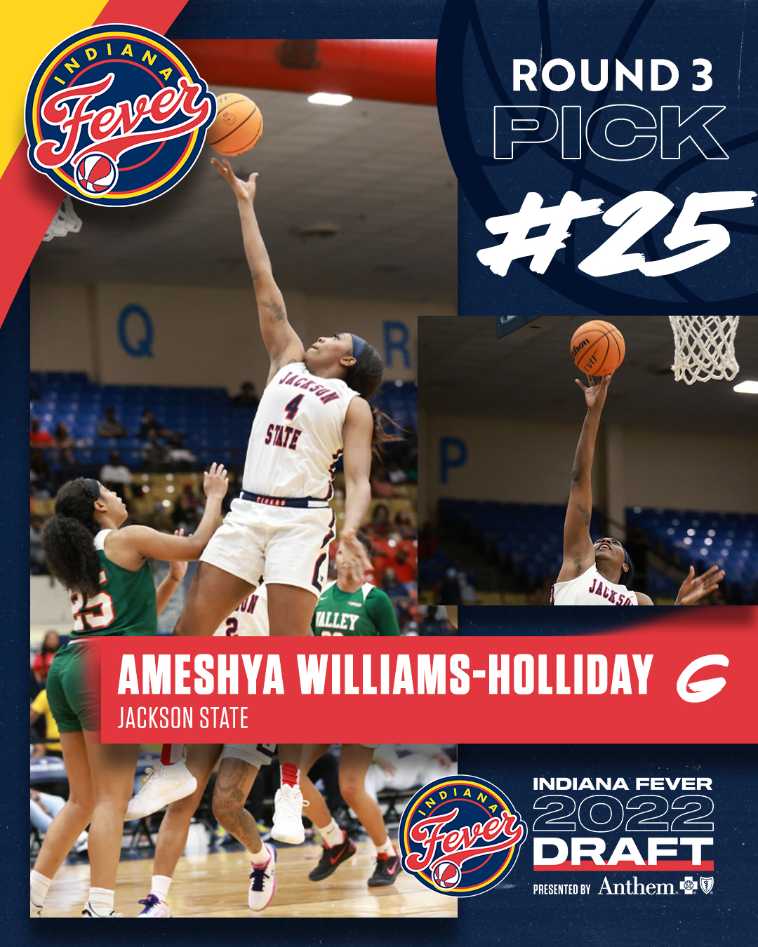 With the 25th overall pick in the WNBA draft, the Indiana Fever selected Ameysha Williams-Holiday, a 6’4 center from Jackson State University.