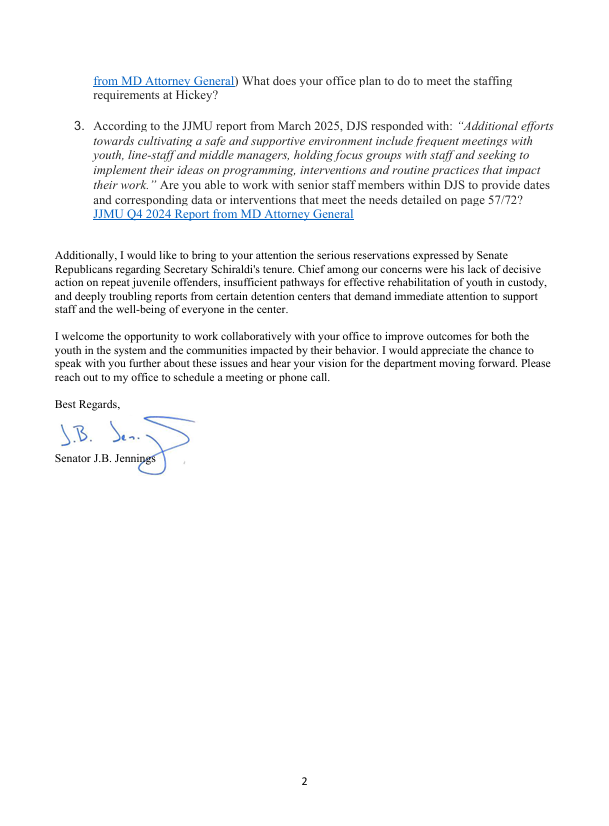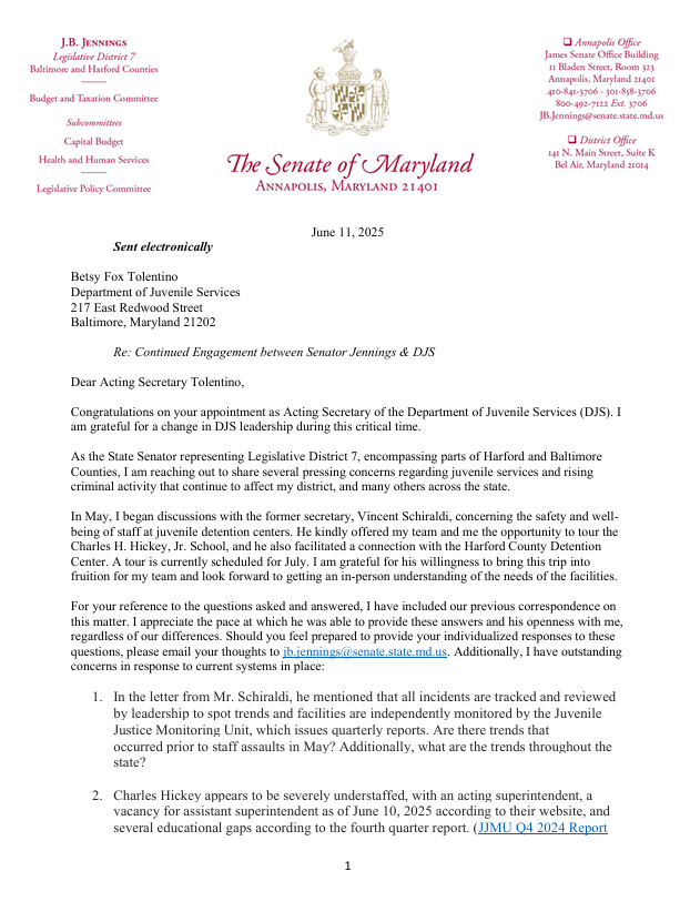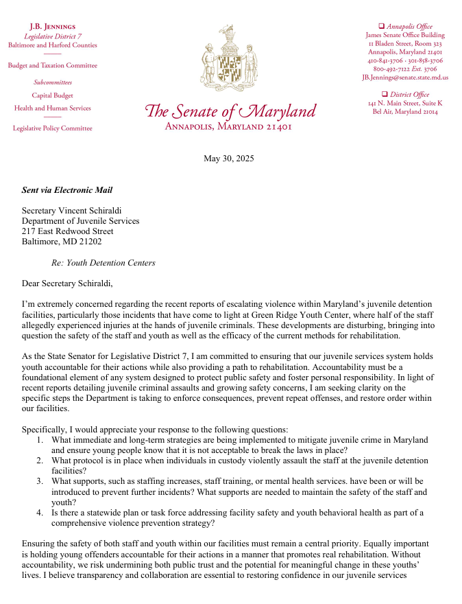 "Ensuring the safety of both staff and youth within our facilities must remain a central priority. Equally important is holding young offenders accountable for their actions in a manner that promotes real rehabilitation. Without accountability, we risk undermining both public trust and the potential for meaningful change in these youths’ lives. I believe transparency and collaboration are essential to restoring confidence in our juvenile services system, and I welcome any opportunity to work with your department to understand the scope of the challenges and the solutions being implemented. At the end of the day, communities need to feel safe, and these young people need to understand the consequences of their actions while being given a path forward. Thank you for your attention to this critical matter. I look forward to your response and to continuing a dialogue that supports a safer and more effective juvenile justice system in Maryland."