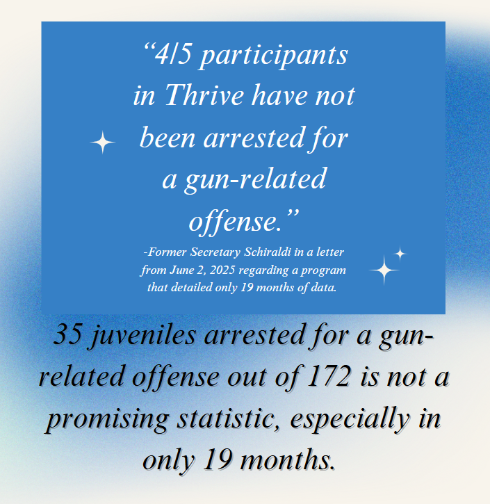 "The Thrive Academy has served 172 youth from September of 2023 to April of 2025. Of those, only 3% have been gun violence victims, none have been homicide victims, and 4 out of 5 have not been arrested for a gun-related offense."