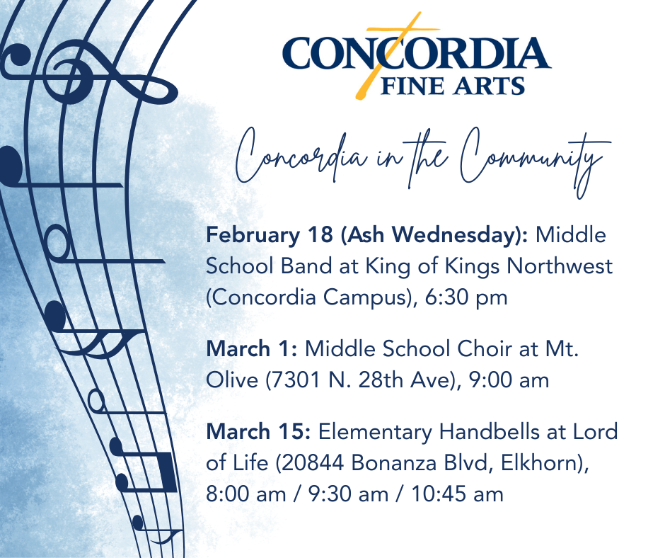 | | Mark Your Calendars for Concordia in the Community! Concordia in the Community highlights opportunities for our students to share their musical gifts during worship services at local churches. All are welcome to attend and support our students! | |