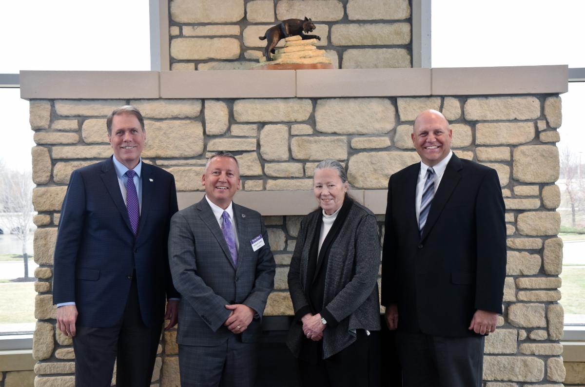 New leadership from K-State's Manhattan and Olathe campuses recently met to learn about the Olathe campus and meet with its faculty and staff. From left to right: Charles Taber, K-State provost; Richard Linton, K-State president; Jackie Spears, interim dean and CEO of K-State Olathe; and Ben Wolfe, upcoming CEO of K-State Olathe.