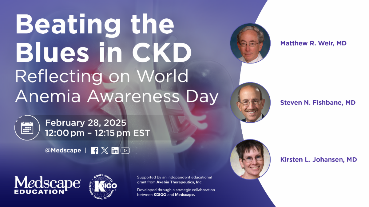 This session will feature expert insights from Matthew Weir, MD (United States), Steven Fishbane, MD (United States), and Kirsten Johansen, MD (United States), who will discuss barriers to timely diagnosis, treatment challenges in dialysis and non-dialysis patients, and emerging therapies that can help close these gaps. You can RSVP and access the live stream on Facebook, LinkedIn, and YouTube. You can also earn CME/CE credit after completing the program. Learn more.
