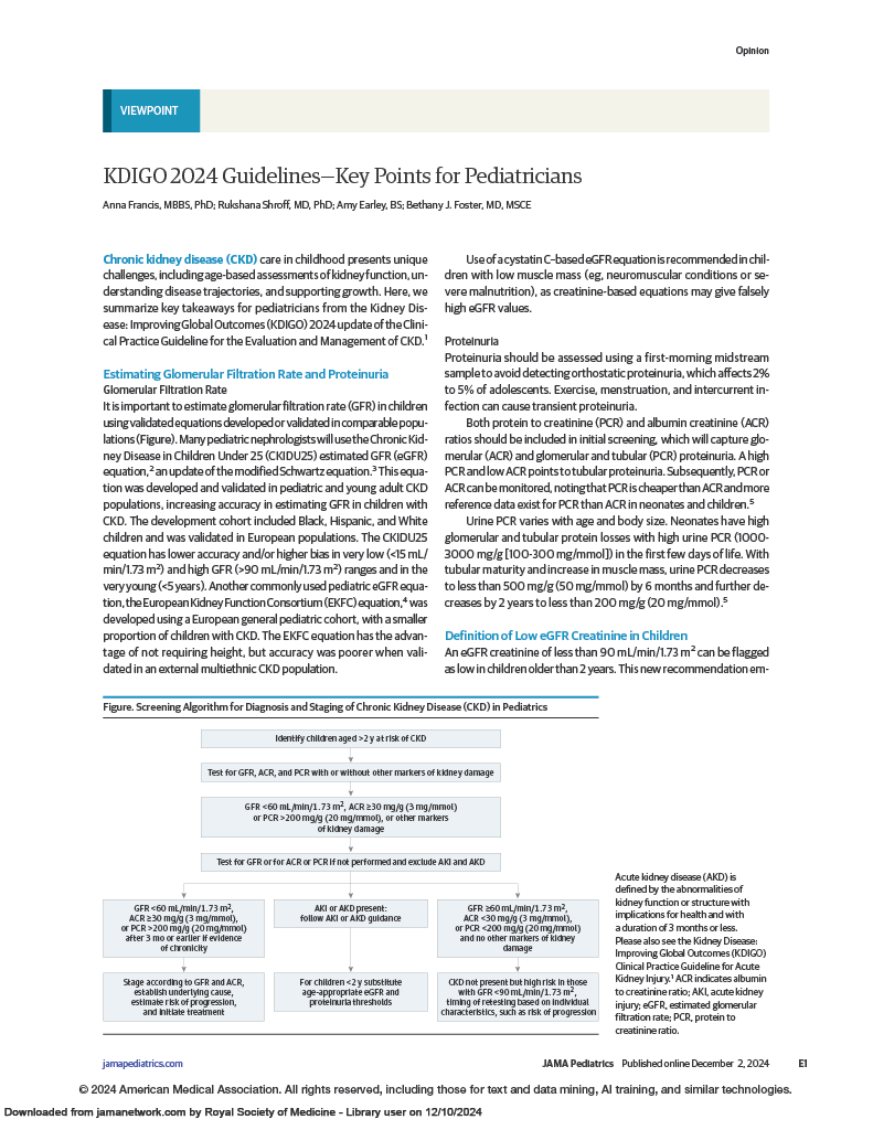 The KDIGO 2024 CKD Guideline includes a dedicated pediatric summary, now published in JAMA Pediatrics, highlighting key updates in the assessment and management of CKD in children. It recommends the CKiD U25 equation for estimating kidney function, with cystatin C-based equations for those with low muscle mass. Proteinuria screening should include both PCR and ACR from a first-morning urine sample. An eGFR below 90 mL/min/1.73 m² is now considered low for children over age 2, emphasizing early detection and intervention.
