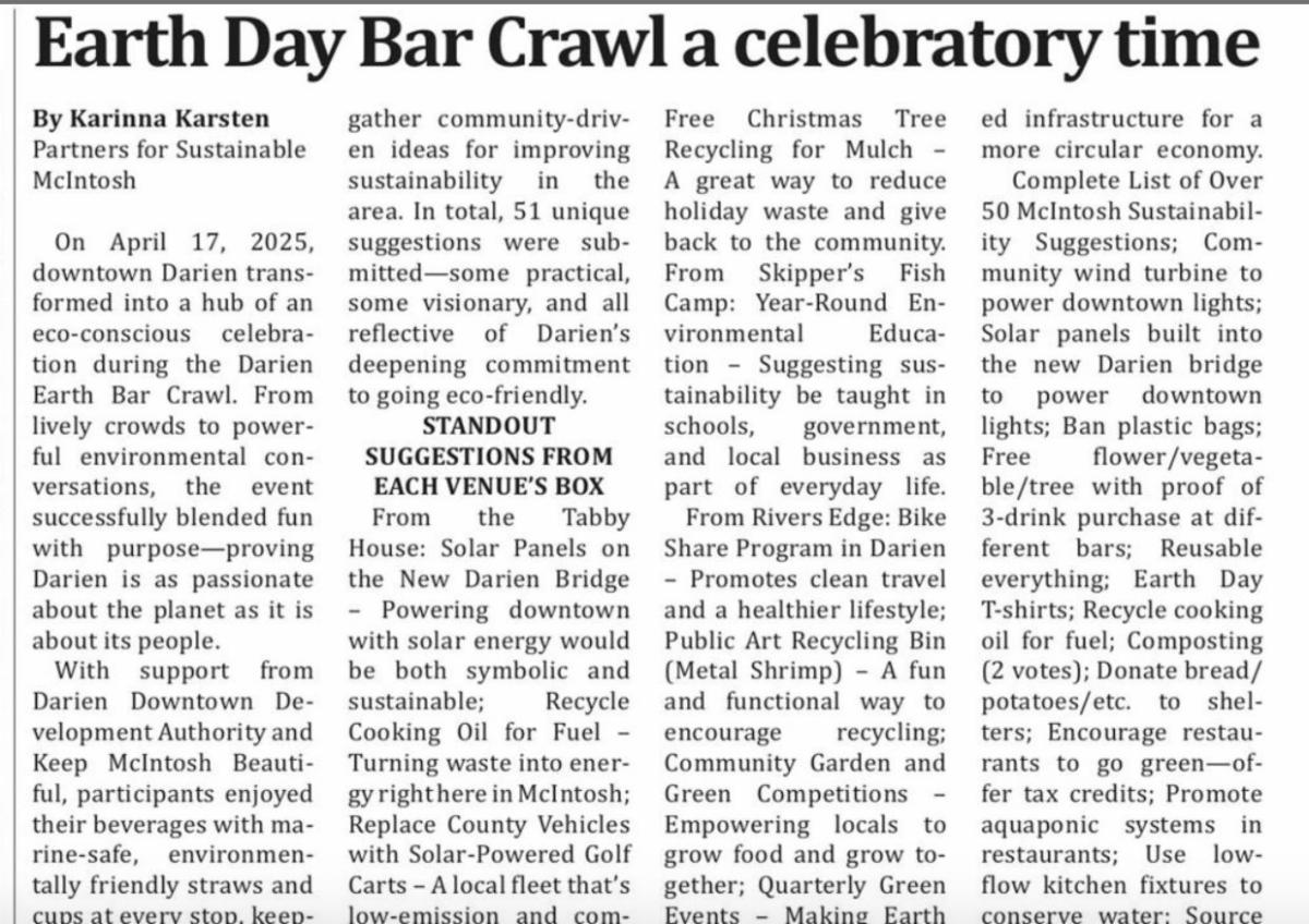 | | The Darien Downtown Development Authority (DDA) and Keep McIntosh Beautiful (KMB) teamed up to promote sustainability across Mcintosh County by supplying local restaurants with eco-friendly cups and straws—replacing traditional Styrofoam and plastic-during the Darien Earth-Inspired Bar Crawl, coordinated by Partners for a Sustainable McIntosh. Looking ahead, the DDA and KMB will continue promoting eco-friendly practices during the upcoming Lions Club waterfront concerts by providing eco-friendly takeout containers and bags (no Styrofoam or plastic) to area restaurants. Thank you to The Darien News for sharing the results of the Bar Crawl created with The Oaks Club and Cedar Bar, Tabby House Brewing Company, Waterfront Wine & Gourmet, Skipper’s Fish Camp and Rivers Edge Bar & Grill, Thank you to the participants and to the community that enjoyed and shared their suggestions for a more sustainable McIntosh and Darien GA. | |