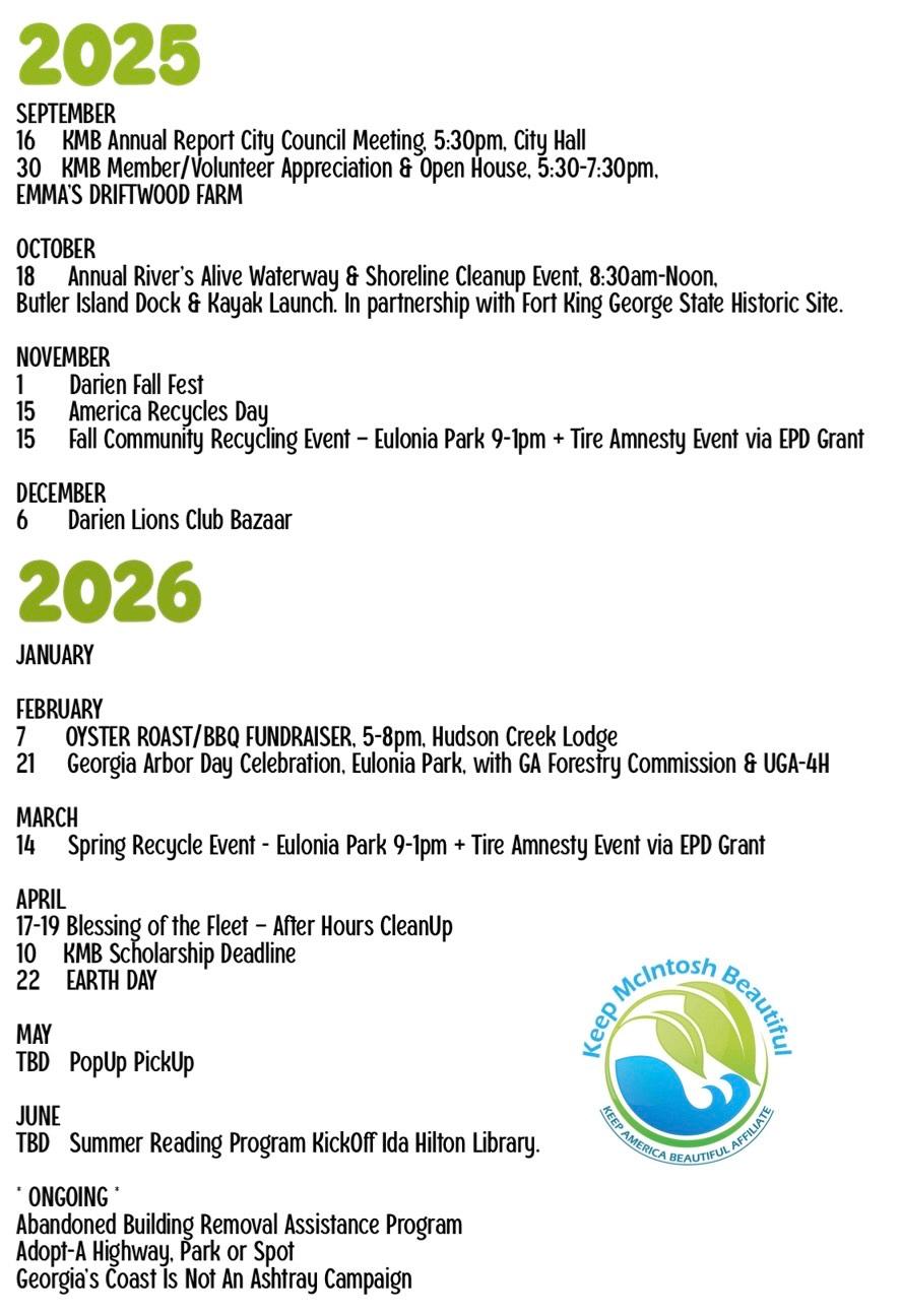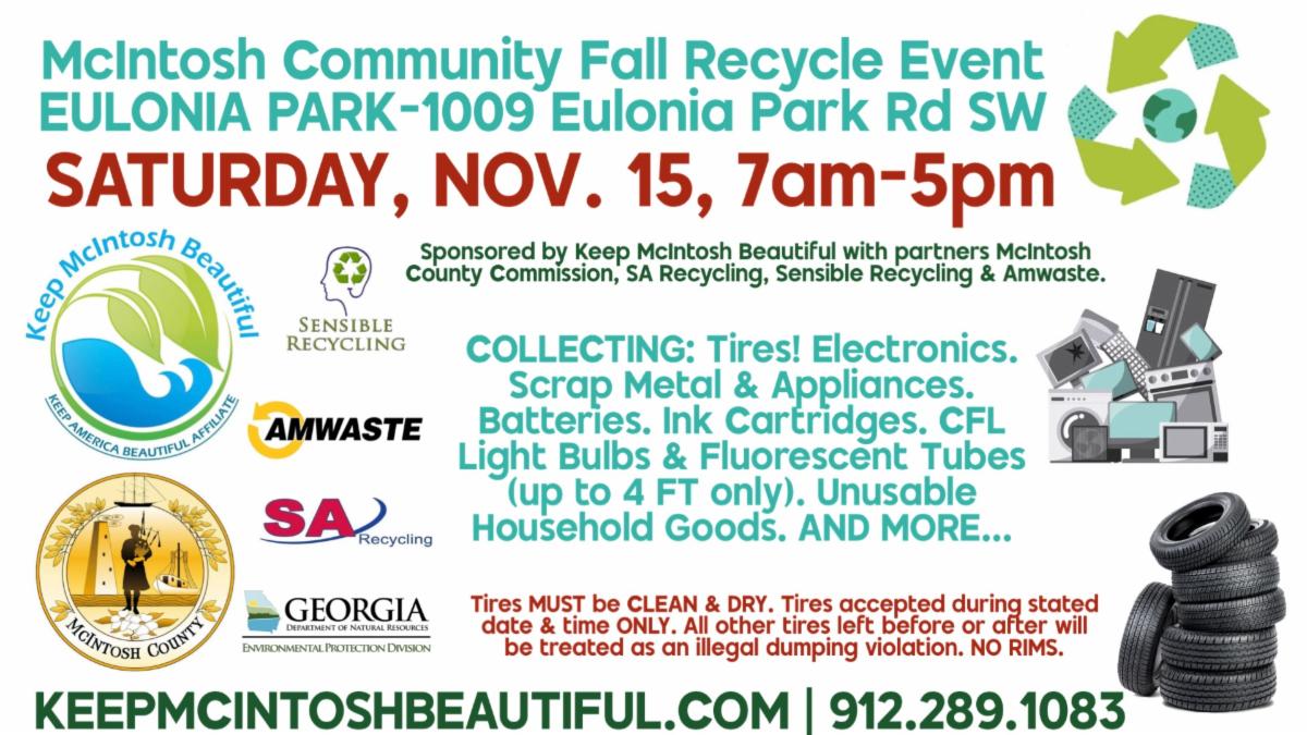Keep McIntosh Beautiful invites you to our Annual Fall Community Recycling Event Saturday, November 15, 2025, 7 AM – 5 PM, Eulonia Park