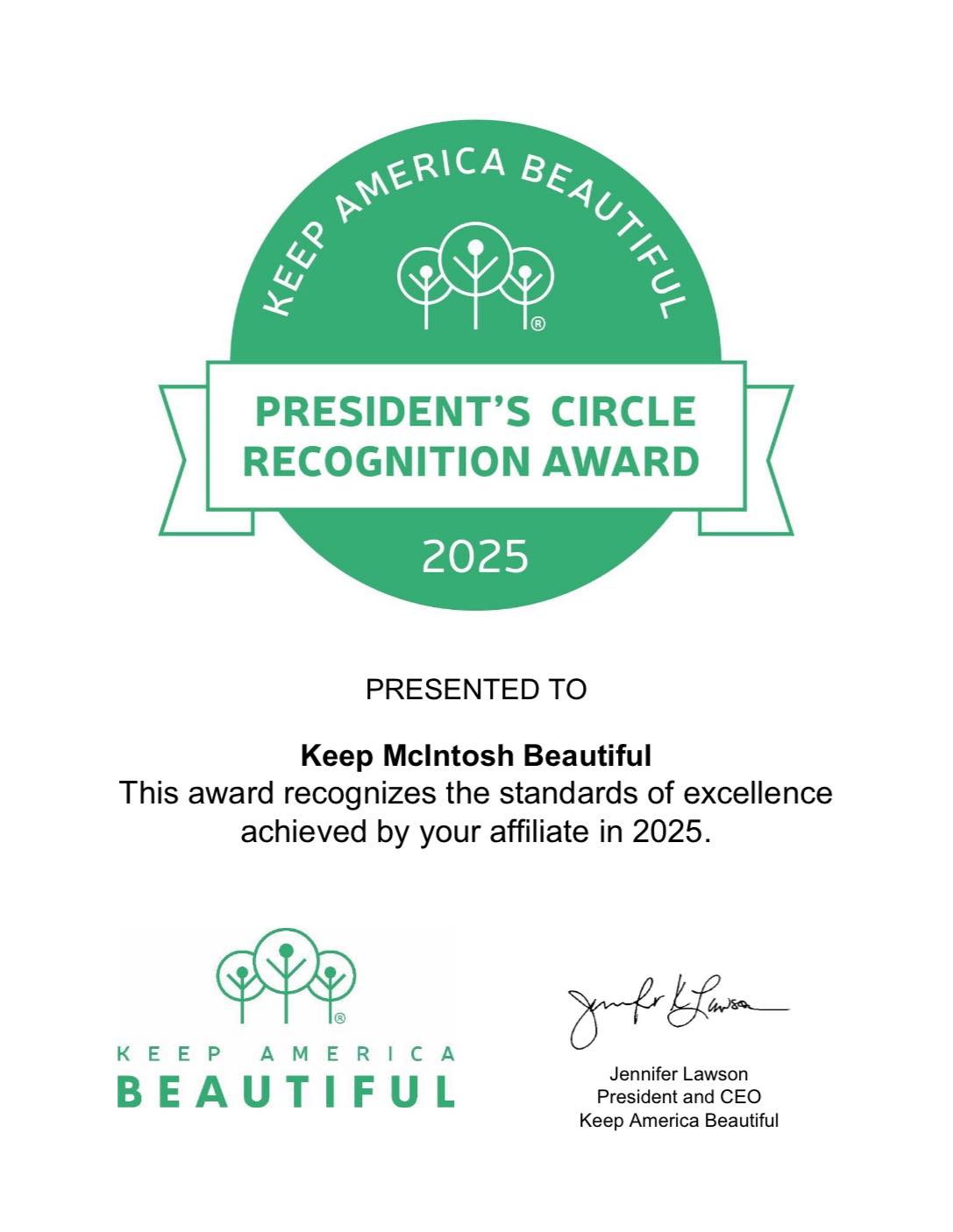We are honored to share that Keep McIntosh Beautiful has been awarded the President’s Circle Award for 2025 by Keep America Beautiful!