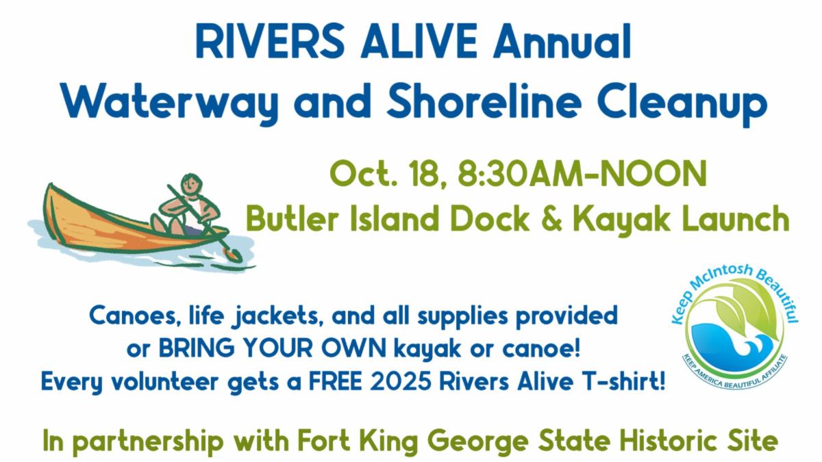 Join us for our annual waterway & shoreline cleanup in partnership with Fort King George State Historic Site! Canoes, life jackets, and all supplies provided — or bring your own kayak or canoe! Every volunteer gets a FREE Rivers Alive T-shirt!