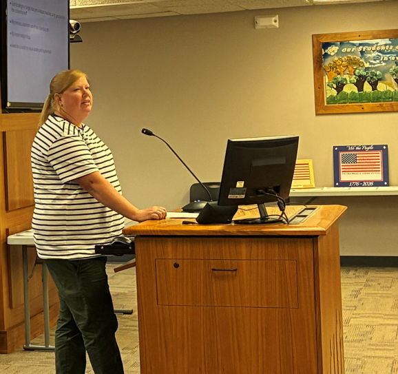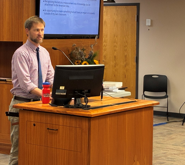| | Two Kansas educators achieve top honors in prestigious citizenship contest | | Thomas Fulbright, a social studies teacher at Hope Street Academy, Topeka USD 501, addresses the Kansas State Board of Education in December. | | Megan Berry, a social studies teacher at Abilene High School, Abilene USD 435, presented to the State Board in November. | | |