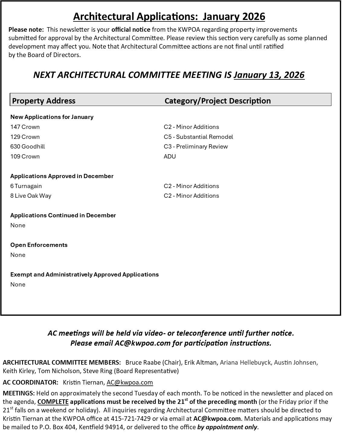 First, I'd like to thank Ann Becker, who served her final meeting on the committee last month. She had spent five years contributing a wealth of historical perspective as a long time Kent Woodlands resident, and I'd like to thank her for having been a staunch supporter of the unique characteristics that make our neighborhood so special. Her tireless commitment to the AC has not gone unnoticed by myself and my fellow board members.