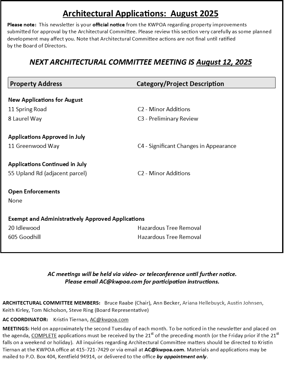 | | Architectural Committee Application Notices | | Please direct any Architectural Committee inquiries to Kristin Tiernan at AC@kwpoa.com. | | |