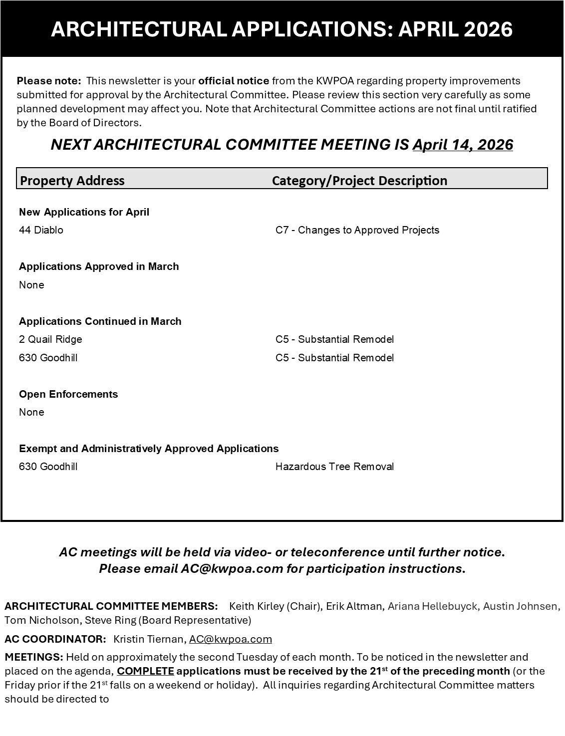 Community meetings will be planned — watch for updates from KWPOA. If you would like more information or want to volunteer for the Undergrounding Committee, please contact Joel Ritch at jritch@kwpoa.com.