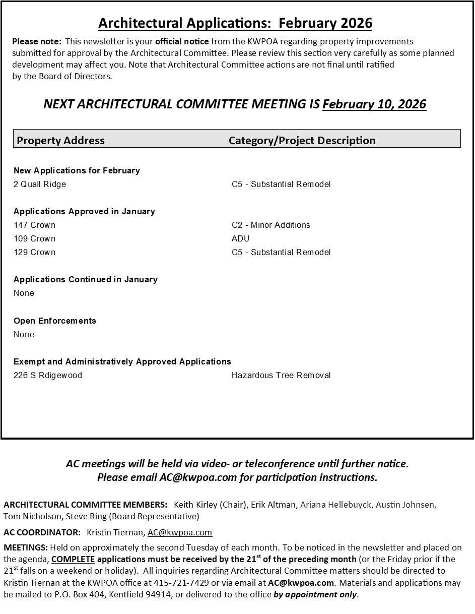 Undergrounding Committee: Thank you to board member Joel Ritch who provided a succinct update on the process and costs involved to underground our electrical lines. This small yet powerful group of volunteers is calling for many more of you that could lend a hand. This is a large undertaking, but as we've recently seen in other parts of Marin, including Tiburon, it’s possible with your help. See article below for information about how to volunteer, and click HERE for the presentation.