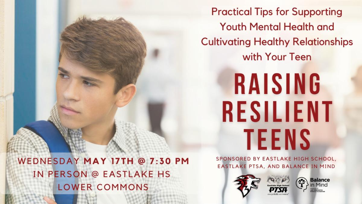 All LWSD families are welcome to attend an in-person parent education event at Eastlake High School on Wednesday, May 17 at 7:30 pm to learn practical strategies for supporting your teen's mental health and nurturing healthy relationships with their family and others. Local expert Sheri Gazitt from Teen Wise will join with a local medical professional and Eastlake High School counselors to cover the pressures and difficulties of being a teen in a high achieving community, how to cultivate healthy relationships, and who to contact at Eastlake HS if you are worried about your child or a friend, plus Q&A. No registration necessary.